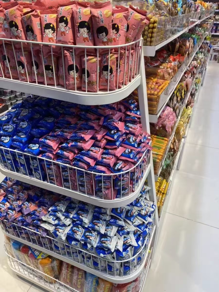 冷轧钢喷塑:耐用、易清洁、防刮耐磨,是零食店首选;轻型每层承重 20–50kg,中型 50–100kg。