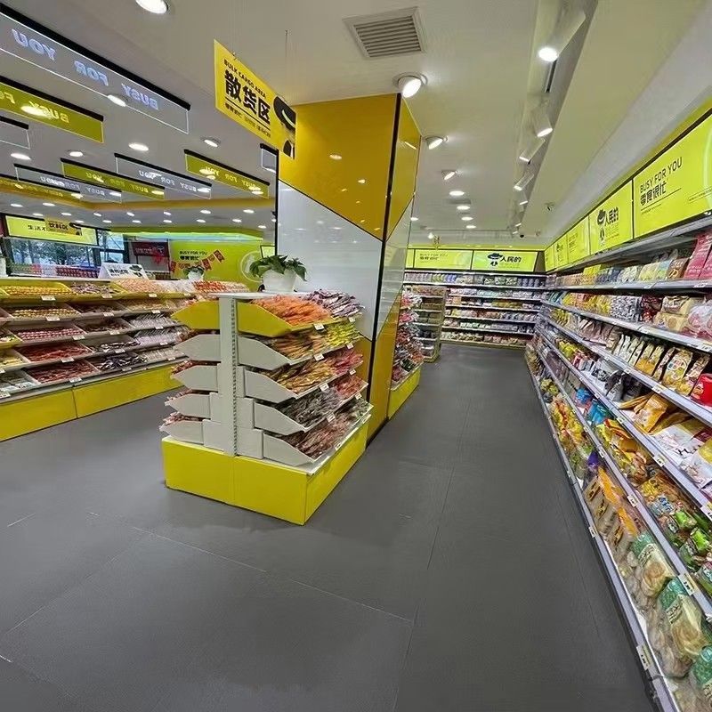 双面中岛货架:置于店铺中央,双面陈列,最大化利用通道流量;多为冷轧钢喷塑,层距可调(适合袋装零食、散装装)配食品盒子,也可以搭配钢层板,宽度常见 0.6–0.8m,通道建议留 1.2–1.5m;端头可做促销位。